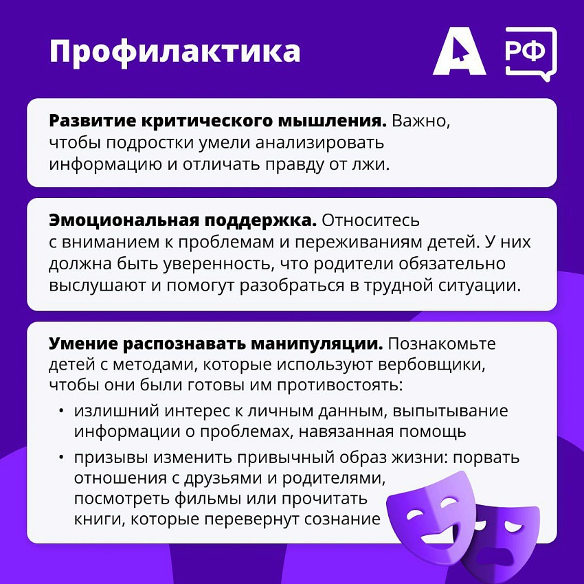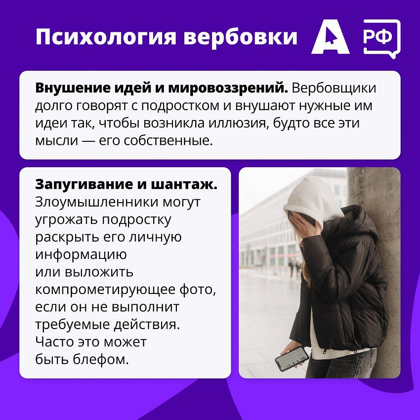 Вербовщики профессионально используют приемы психологического давления – их этому обучают. Злоумышленники используют определенные фразы, речевые обороты, определенные постановки вопросов, запугивание и шантаж. Часто они пишут, что знают, где вы живете или где учитесь. В случае отказа незнакомцы угрожают убийством – обещают найти и наказать. На самом деле они ничего не знают. Не замыкайтесь в себе, расскажите классному руководителю, учителю или родителям;