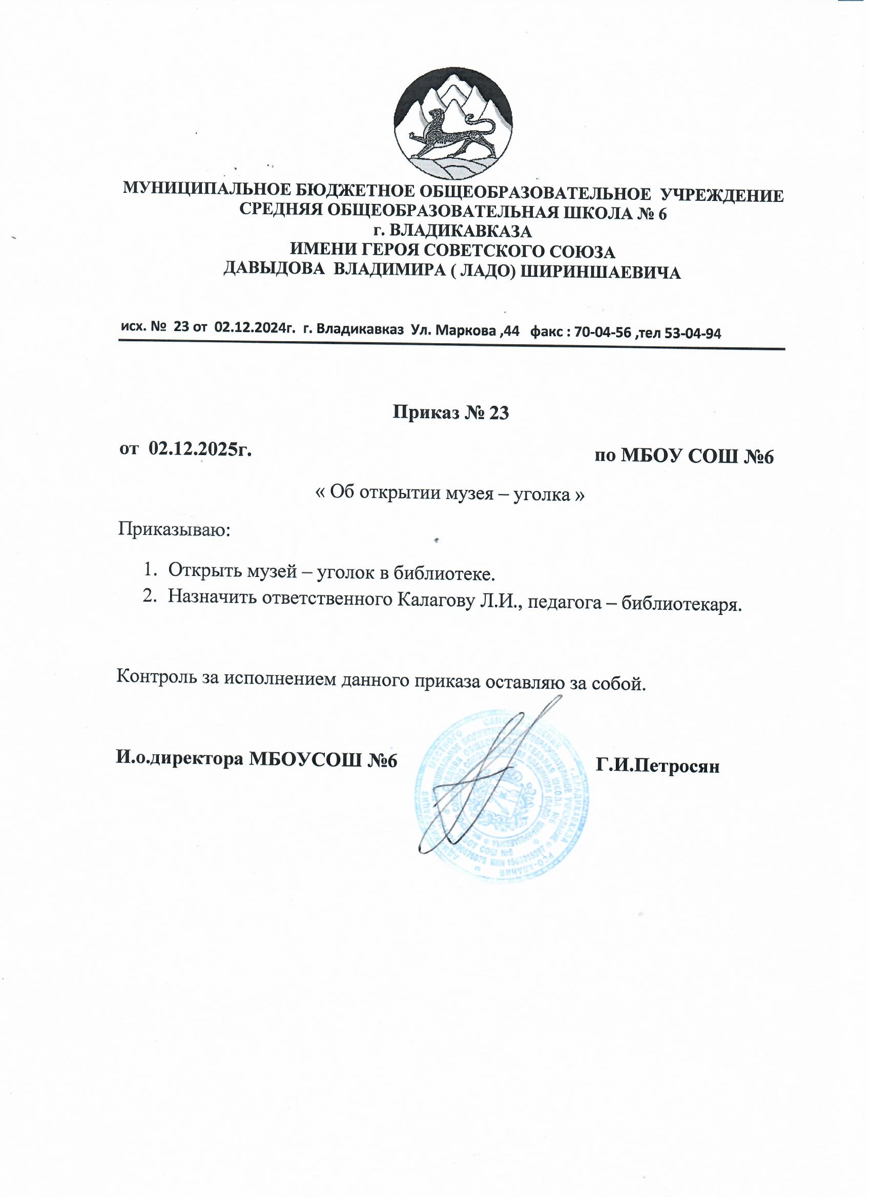 Приказ МБОУ СОШ №6 от 02.12.2025 №23 "Об открытии музея - уголка"