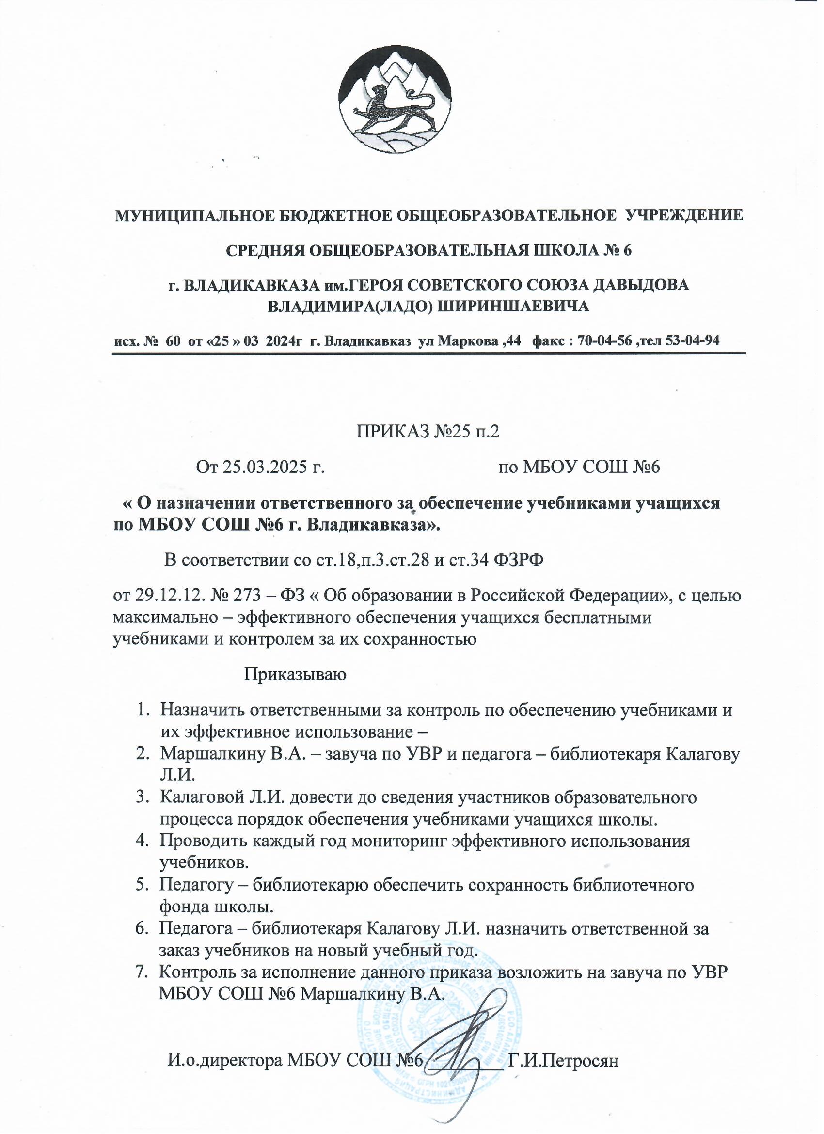 Приказ №3 от 15.05.2024 О назначении ответственного за обеспечение учебниками учащихся по МБОУ СОШ №6